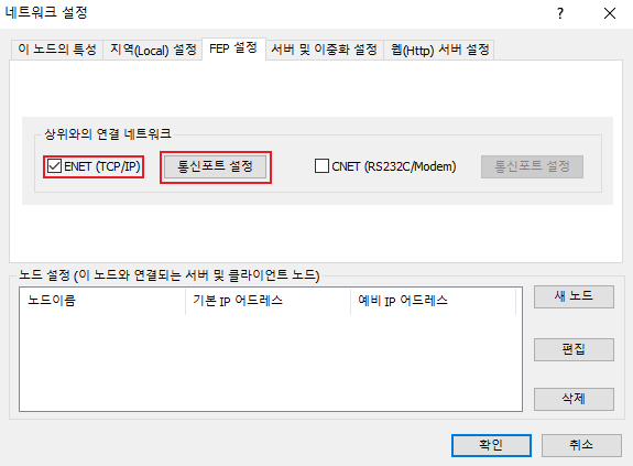 FEP 설정에서는 상위와의 연결 네트워크 란에서 ENET (TCP/IP) 항목을 체크하시고 통신포트 설정을 눌러 팝업 창을 띄웁니다.